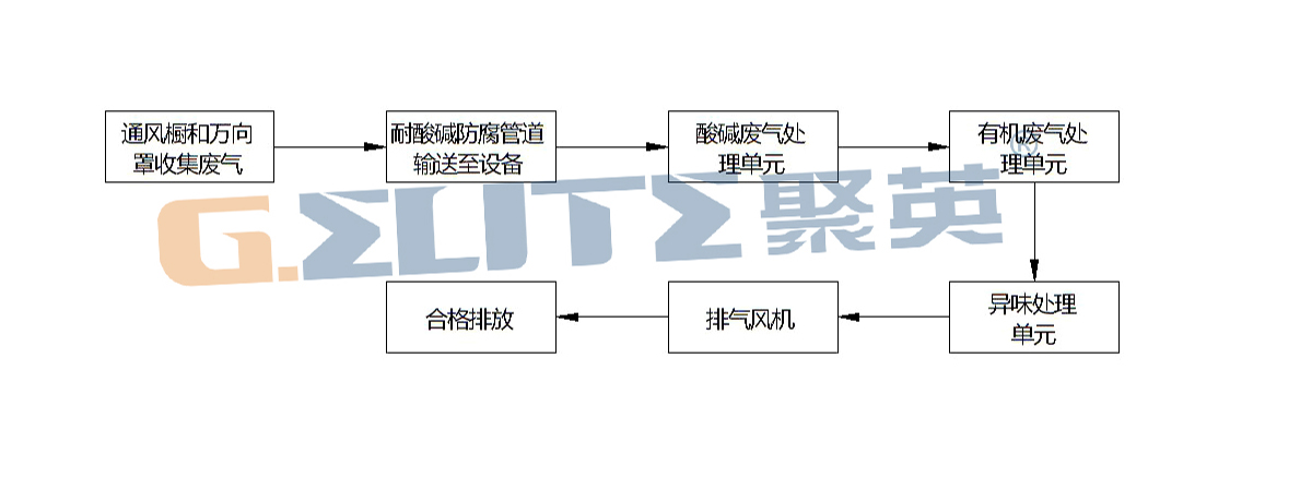 備注:以上工藝流程是廢氣綜合處理的工藝,針對(duì)不同的廢氣將采用不同處理工藝。