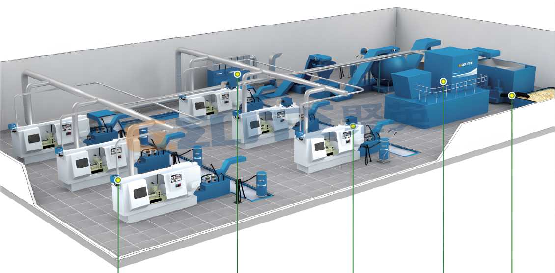 多工位集中油霧凈化治理適用于機床數量規模較大,或者多臺、多種類型開放式機床,通過吸氣罩或吸氣臂形式收集油霧氣體,并且有條件設置排氣筒的情況,前端收集油霧氣體,通過管道集中輸送到凈化主機中過濾凈化后,通過風機和煙囪潔凈空氣排入大氣